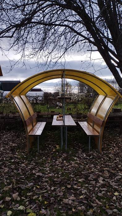 Длина беседки– 2м, ширина 1,7м. Этого достаточно, чтобы разместить 6-8 человек за столом, ширина которого 0,58м, а длина 2м. Каркас «Трали-Вали» сделан из оцинкованных металлических труб, покрытие – сотовый поликарбонат. Днем крыша арочной формы защитит от палящих лучей солнца, а в дождь укроет от непогоды.